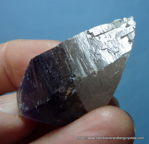 Description: A double terminate amethyst quartz crystal with a phantom, which shows a different colour near the base of the amethyst. At the back of the crystal is an area over the amethyst where the outer layer of smooth quartz is lacking. The main termination point has no damage, but the rest of the specimen has a few nicks. It displays well on a flat surface, all-round. Weight of Specimen: