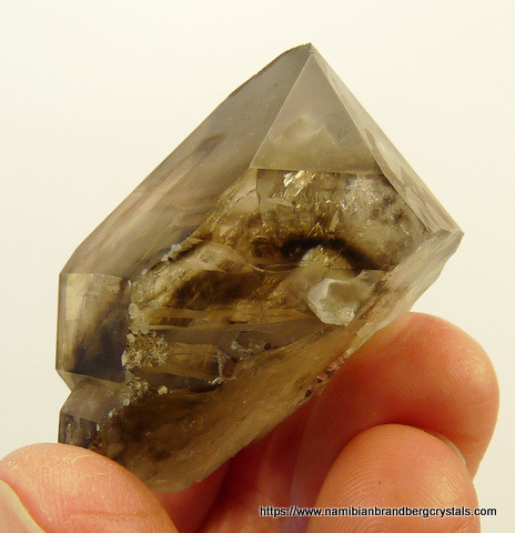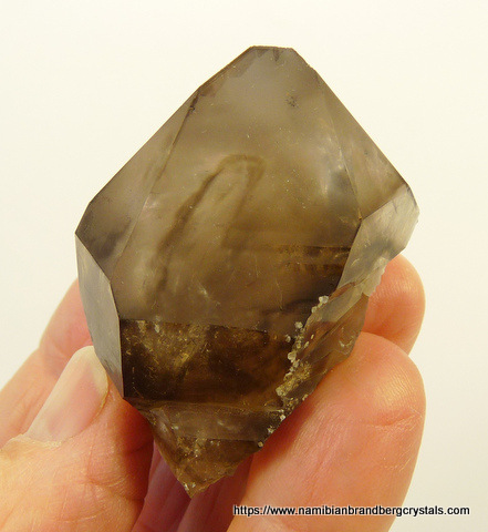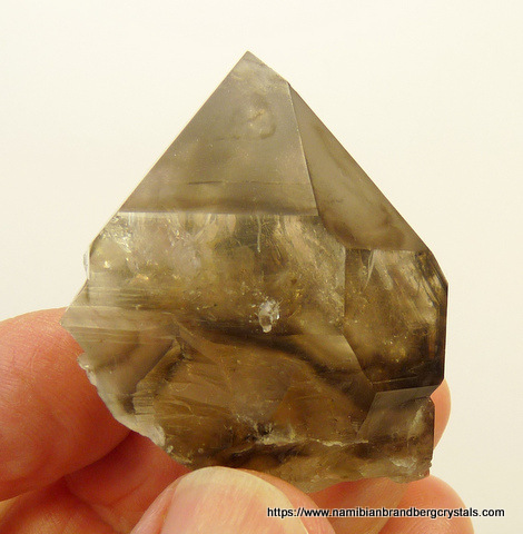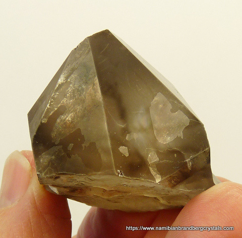 Measurements: 46 x 37 x 33 mm Description: A smoky quartz crystal (similar to some from Brandberg) with the termination faces having a matt appearance. The short shaft facets have good clarity. The inside has patches of darker smoky colouring, gas and flaws. The termination point has only a few minute nicks (barely visible with the naked eye), while the rest of the specimen has a few small nicks. This specimen formed part of a spectacular find near Steinkopf, Northern Cape. Weight
