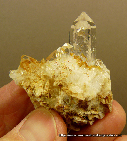 49 x 38 x 25 mm Description: Quartz crystals sit on a quartz matrix with feldspar. The main crystal has lovely gas inclusions. The
