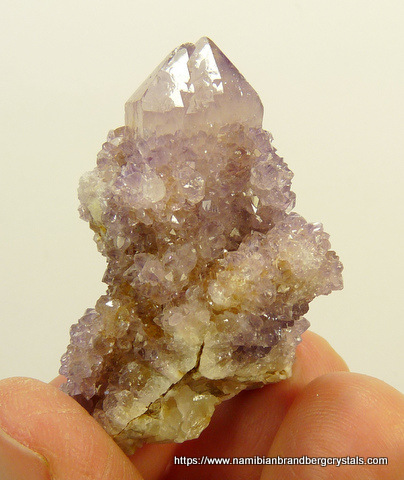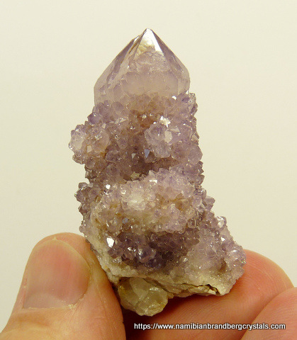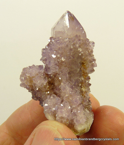 Description: A group of light amethyst cactus quartz crystals share a small quartz matrix. The termination and rest of the