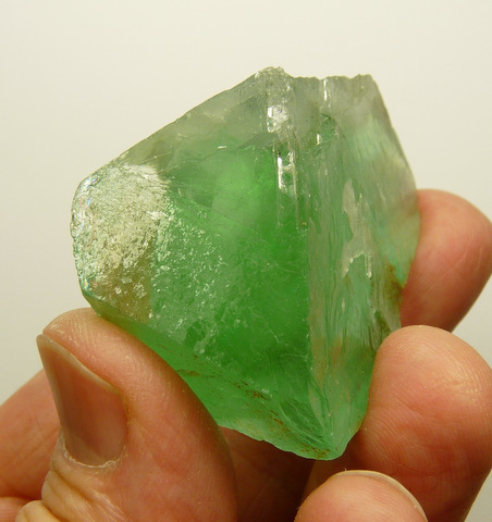 58 x 37 x 23 mm Description: A green fluorite crystal with fairly good transparency, and bits of iron oxide on a part of its surface. It has a few
