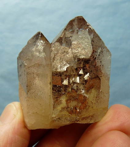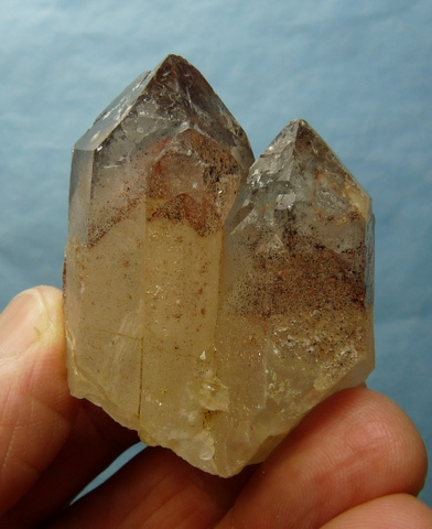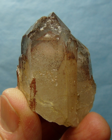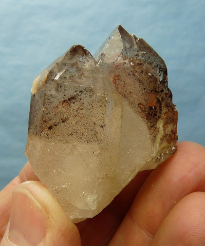 50 x 39 x 23 mm Description: A quartz specimen with phantoms caused by hematite having been captured between layers of quartz growth. The orangy phantoms formed first, then the darker ones formed later, just under the final outer layer of quartz. The