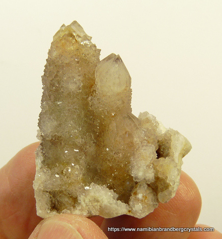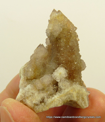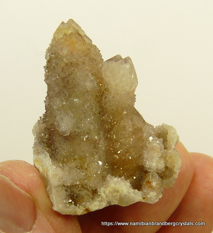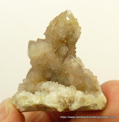 30 mm Description: A group of cactus quartz crystal sit on a trimmed quartz matrix. The terminations are undamaged, but there are some contact marks near the base of the specimen. It displays well on a flat surface. Weight