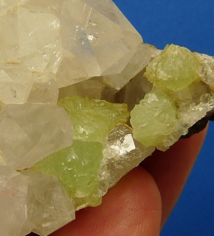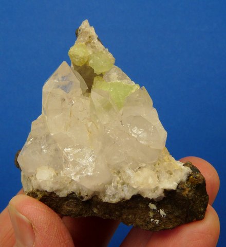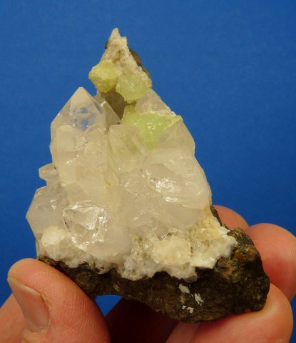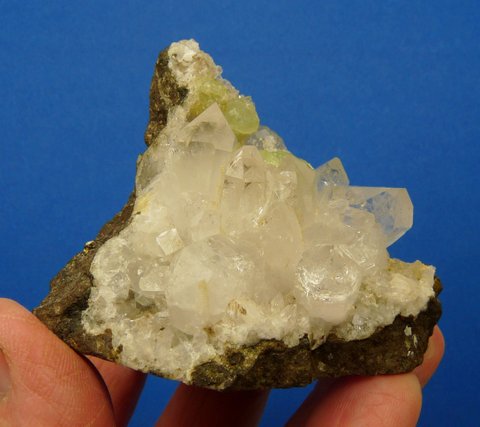 Measurements: 65 x 55 x 48 mm Description: A lovely arrangement of quartz, prehnite and calcite on a basalt matrix. The quartz crystal terminations have only few minute nicks, otherwise there is some damage to the edges of the specimen. The specimen has been trimmed at the base to display better. Weight of Specimen: 151.6 g Chemical Composition: