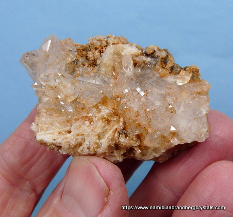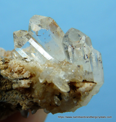 Description: Quartz crystals sit on a matrix of mainly quartz and basalt. A few of the crystals have minute reddish hematite threads and specks inside. Some of the