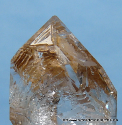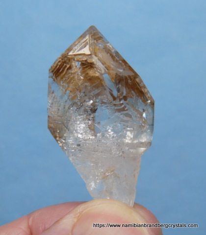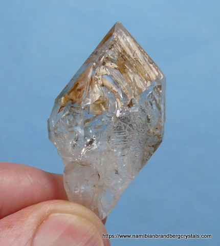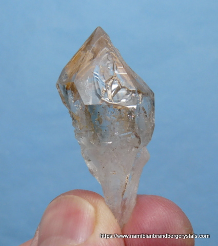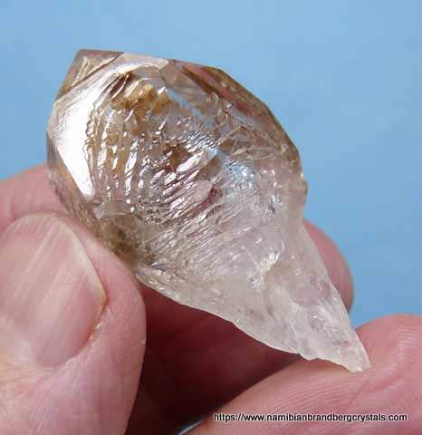 x 22 x 17 mm Description: A window quartz crystal with lovely growth patterns and bits of feldspar on some surfaces. The termination point has an extremely small nick (barely visible with the naked eye), while the rest of the crystal has a few nicks. Weight