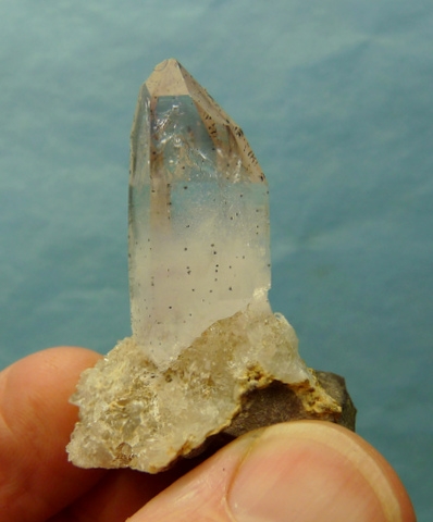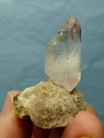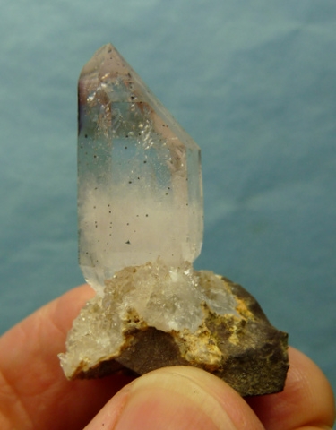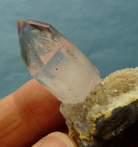 Description: A quartz crystal with a hint of amethyst colouring, gas and bits of hematite inclusions, sits on a quartz and basalt matrix. There is one minute, still bubble, and one very minute bubble that moves in a V-pattern (when carefully tilted), with the one leg of the "V" quite a bit longer than the other. Close to the termination point is a minute, raised area of quartz in almost a droplet shape. The