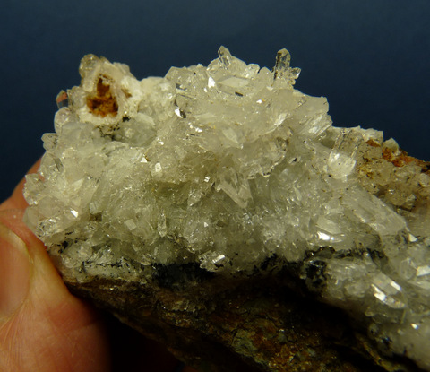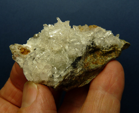 Measurements: 71 x 35 x 25 mm Description: Small, mostly sparkling and gemmy quartz crystals on a quartz and basalt matrix, including clusters. There are minute bits of a whitish mineral attached (unknown to us). The specimen, that can be enjoyed with the help of a good magnifying glass or a loupe. has a few nicks, mostly along the edges. The matrix has a thin flaw. It displays well on a flat surface. It comes from a rare find in 2015. Weight of Specimen: 51.9 g Chemical