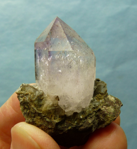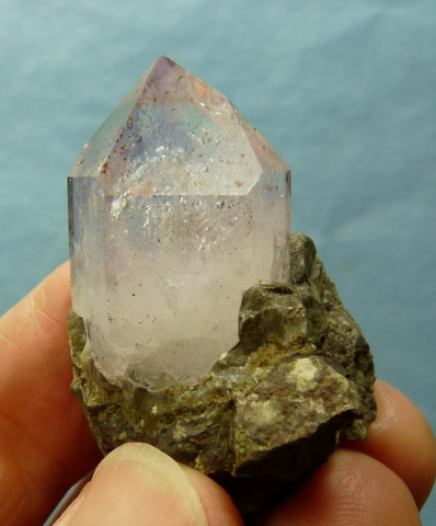 A light amethyst quartz crystal with (mostly) red hematite specks, sits