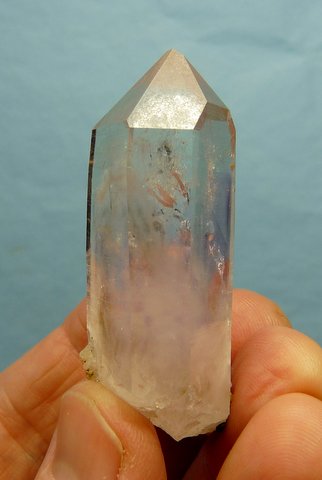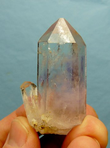 Measurements: 58 x 35 x 21 mm Description: A group of quartz crystals with the main one having a few clouds of faint amethyst colouring and a small, still bubble, just below midline. When looking through a strong magnifying glass, a very minute moving bubble can be seen towards the centre of the crystal. There is a small piece of matrix still attached to the specimen. The only notable damage is a few internal flaws, and damage near the base where it parted from its matrix. Weight of Specimen: 46.0 g Chemical Composition: SiO2 Hardness on Mohs Scale: 7 Location: Brandberg, Namibia. Specimen Code: NBB 106 US $ 95 . . .