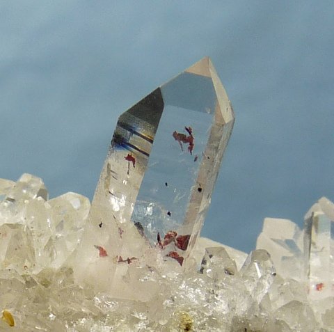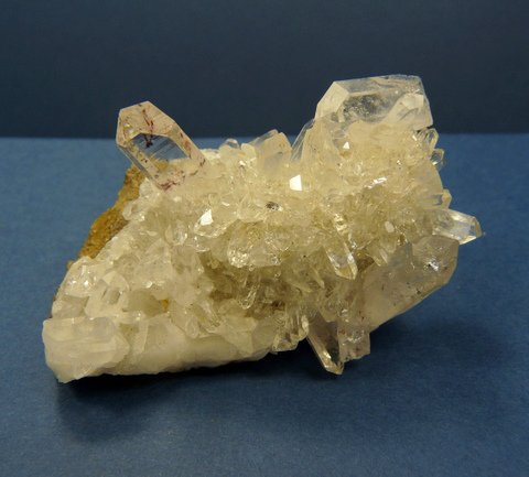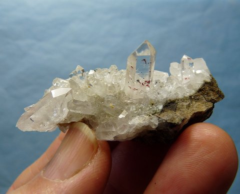 Description: A group of mostly clear quartz crystals witha few having reddish hematite incluisons, and a small piece of basalt matrix attached. Damage is