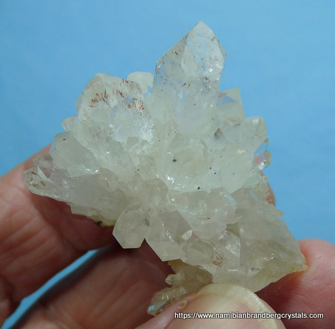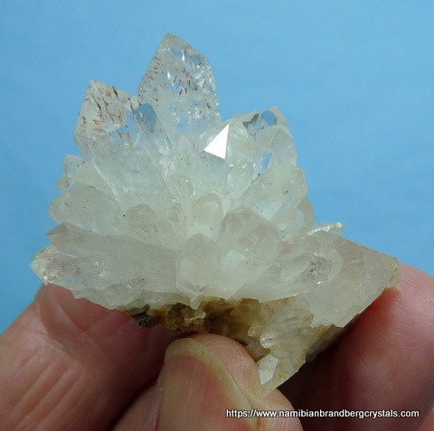Measurements: 47 x 32 x 27 mm Description: A cluster of clear quartz crystals, with some having a light harlequin effect due to red hematite inclusions, sits on a small chalcedony matrix. Some of the crystals have broken off. Weight of Specimen: 29.5 g Chemical Composition: SiO2 (quartz and chalcedony) Hardness on Mohs