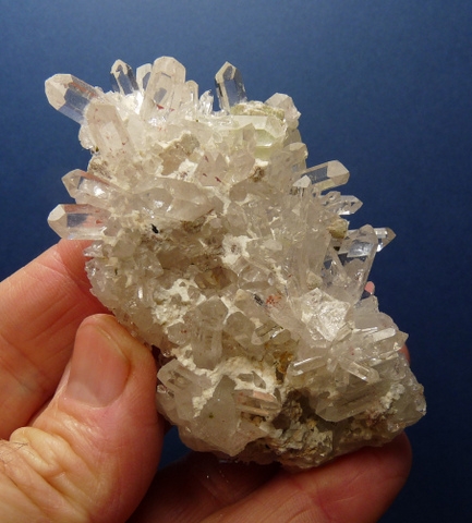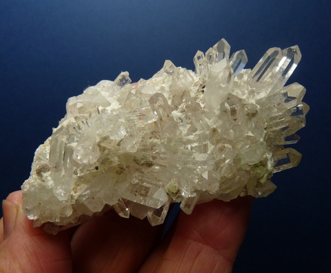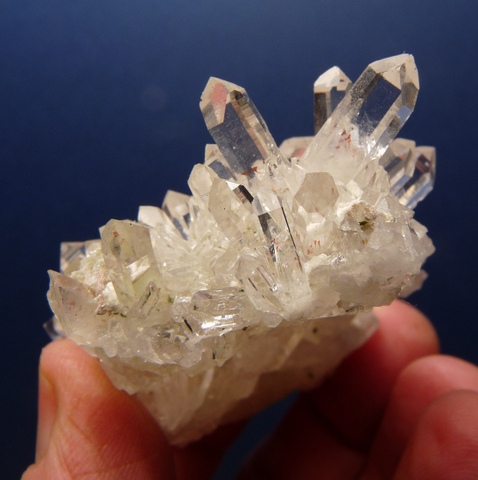 Measurements: 83 x 48 x 25 mm Description: A group of clear quartz crystals, some with bits of red hematite inclusions. There are a few small prehnite crystals and white feldspar among the crystals, also a few very minute bits of epidote. Some of the crystals are damaged. The specimen displays well on a flat surface. Weight of Specimens: 79.7 g Chemical Composition: SiO2 (quartz) Hardness on Mohs