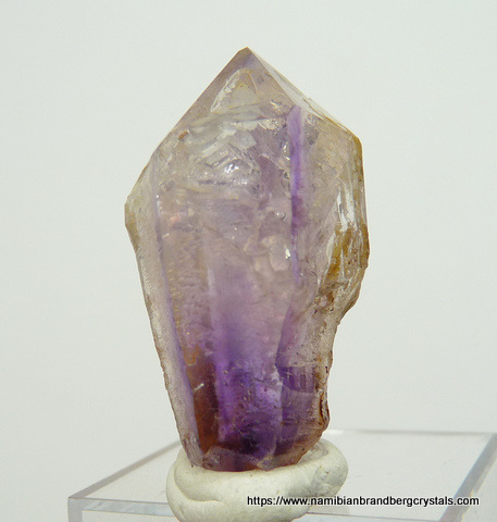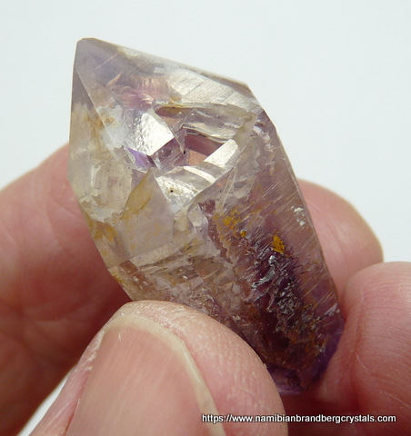 Measurements: 35 x 19 x 16 mm Description: A window quartz crystal with amethyst coloured interior, mainly in its lower part. A few deep windows reveal fascinating 'negative' crystal growth. The only notable damage is a contact mark near the bottom of the crystal. Weight of Specimen: 12.3 g Chemical Composition: SiO2 Hardness on Mohs Scale: 7 Location: Brandberg, Namibia. Specimen Code: NBB 154 US $ 35