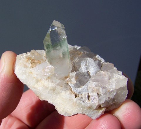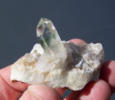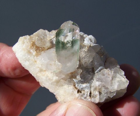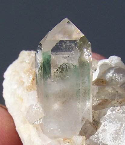 Measurements: 56 x 40 x 32 mm Description: A clear quartz crystal with two facets having a thin layer of chlorite just beneath the surface. The main crystal (26 x 09 x 08 mm) has minute nicks near the termination and a chip lower down. It shares a matrix of calcite and broken quartz with a few smaller crystals. Weight of Specimen: 47 g Chemical Composition: SiO2 Hardness on Mohs Scale: 7 Location: Brandberg, Namibia. Specimen Code: NBB 158 US $ 25