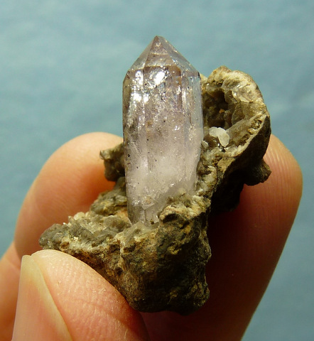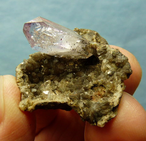Description: A small quartz crystal with lovely gas inclusions, a faint amethyst colouring and bits of hematite inclusions, sits on the side of an exposed calcite and quartz geode. The only damage to the geode, is on its edges. The quartz crystal has a very small nick near its bottom. Weight