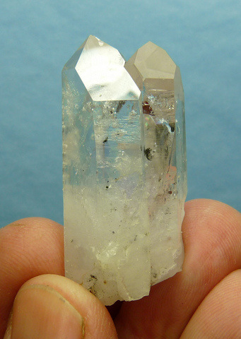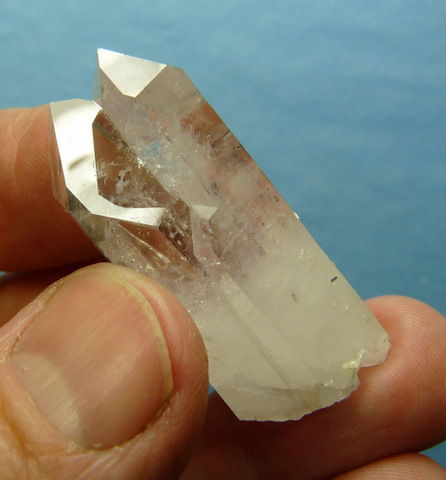 Measurements: 44 x 19 x 18 mm Description: Twin quartz crystals, intergrown with each other. The crystals have a very small epidote spray inclusion as well as a few hematite specks. The terminations have no damage, but lower down on the specimen are a few flaws and pressure / contact marks. Weight of Specimen: g Chemical Composition: SiO2 Hardness on Mohs Scale: 7 Location: Brandberg, Namibia. Specimen Code: NBB 171 US $ 35 .. . .