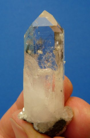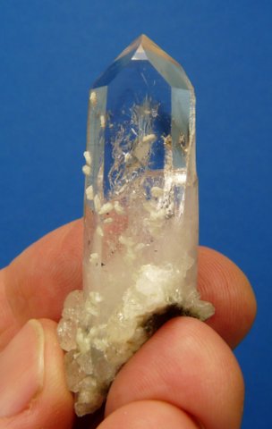 Measurements: 56 x 22 x 17 mm Description: A lovely, gemmy, clear quartz crystal with very pale green bits of prehnite attached to its surface. Along with a few calcite and analcime crystals at its base, it sits on a small matrix of quartz and basalt rock. There is a very faint light smoky phantom. There are a few natural pressure marks to the specimen, and only a few extremely minute nicks to the termination (hardly visible with the naked eye). There is a small quartz crystal fused to the side of the quartz crystal, which has lost its termination. Weight of Specimen: 17.8 g Chemical Composition: SiO2