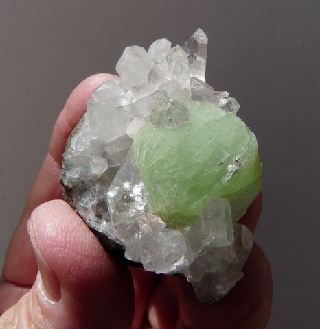 Measurements: 53 x 48 x 23 mm Description: A lovely green ball op bladed prehnite (22 x 19 mm) shares a basalt rock matrix with several clear quartz crystals. There is a tiny bit of quartz attached to the surface of the prehnite ball. The prehnite appears to have no damage, few very small nicks to one of the quartz crystals, but some of the crystals on the edges of the specimen is damaged (visible on image bottom right). Weight of Specimen: 55.1 g Chemical