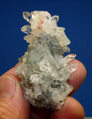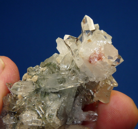 Measurements: 58 x 35 x 28 mm Description: A cluster of quartz and calcite crystals on a matrix of basalt, with traces of epidote. The red colouring in the calcite appears to be hematite. Some sections of the specimen has some damage. Weight of Specimen: 35.6 g Chemical Composition: