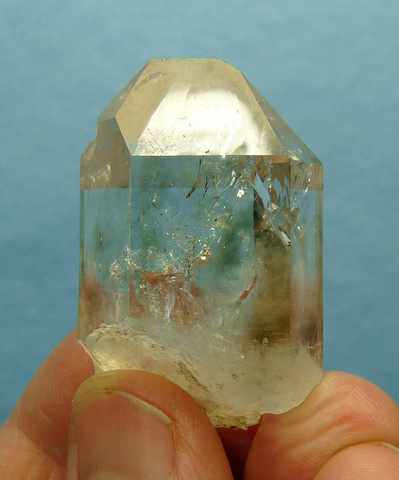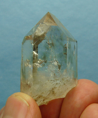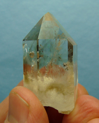 Description: A quartz crystal with very faint smoky clouds. It has a minute bubble that travels well in an almost triangular cavity, about 5 mm long. Best viewed through magnification. The female