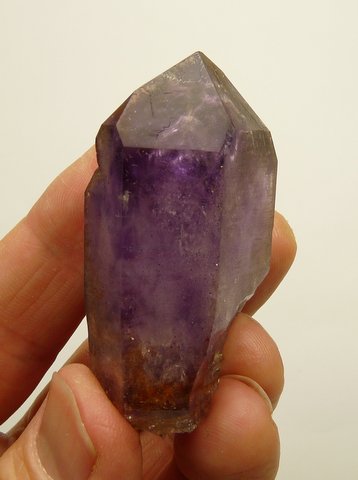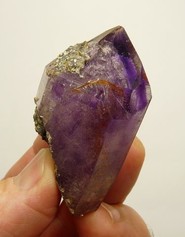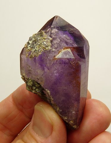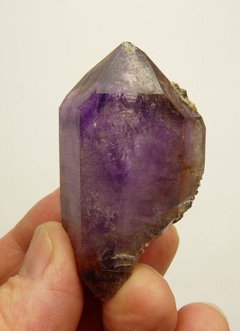 Measurements: 58 x 31 x 23 mm Description: A quartz crystal with amethyst colouring, ranging from medium to light purple, with a lovely bubble (see image top right) towards the middle of one of the termination facets. It measures about 2.5 mm in diametre and moves in a cavity of roughly 5 mm. A few mm from there is something that can perhaps be a bubble / trapped air measuring about 7 mm in diametre, but it does not appear to move. There are lovely growth and termination patterns, gas and and numerous (mostly reddish) very minute hematite specks. A small nick on the termination facet ridge, just above the rock-like bits of matrix. At the narrower end there is a small flaw. Weight of Specimen: 54.4 g Chemical Composition: SiO2 Hardness on Mohs Scale: 7 Location: Brandberg, Namibia. Specimen Code: NBB 221 US $ 95 .. .