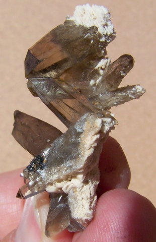 Measurements: 46 x 23 x 16 mm Description: An interesting arrangement of smoky quartz crystals, feldspar and pieces of schorl. One of the main quartz crystals has broken off and a bit of schorl grew over the break. The rest of the specimen has little damage. Weight of Specimen: 10.9 g Chemical