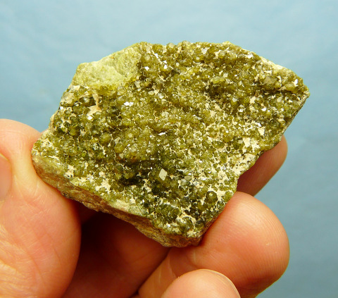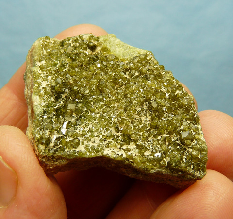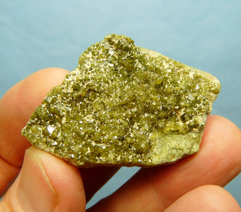 Description: Small, gemmy, drusy andradite (variety demantoid) garnets sit on a thin slab of feldspar. Some of the crystals, mostly to the