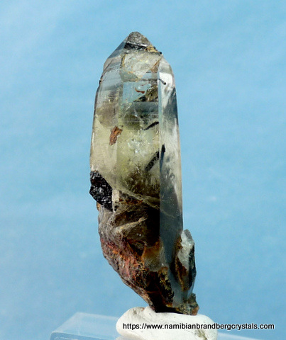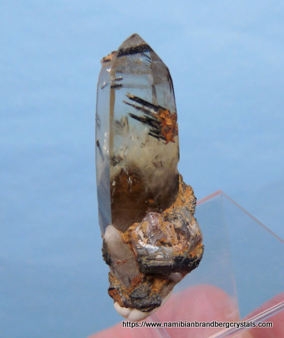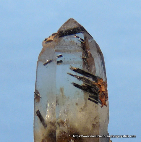 mm Description: A quartz crystal with very light citrine colouring, schorl that is in as well as on the crystal, and a smoky phantom. This is part of a rare find at Erongo. We managed to obtain only three of these specimens. The