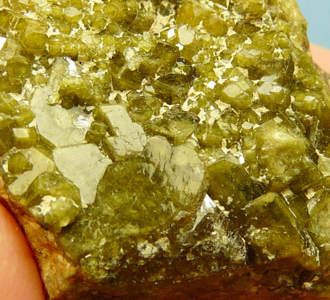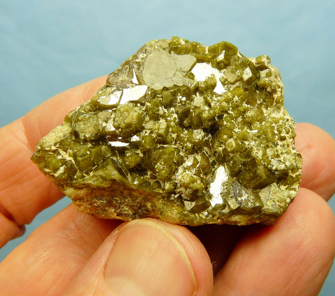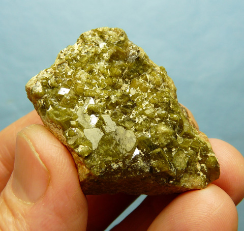 Description: Green andradite garnets (variety demantoid), the largest 11 mm on edge, sit on a feldspar matrix. The bottom of the specimen also has a few minute garnet crystals on it. A few of the crystals are damaged. Weight of Specimen: 51.1 g Chemical Composition: Ca3Fe32+(SiO4)3