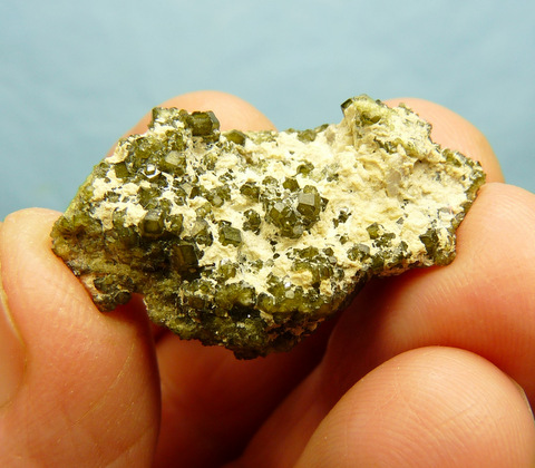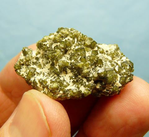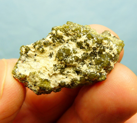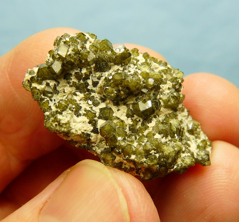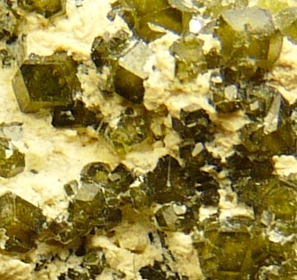 Description: A two-sided specimen consisting of a group of green andradite (variety demantoid) garnets with feldspar covering some sections of it. Some of the demantoid crystals have