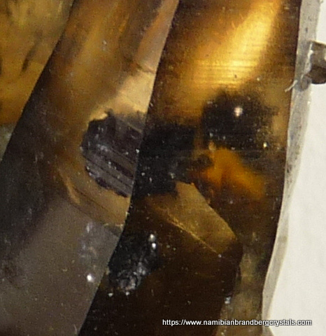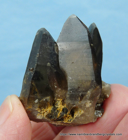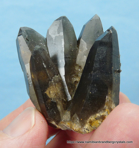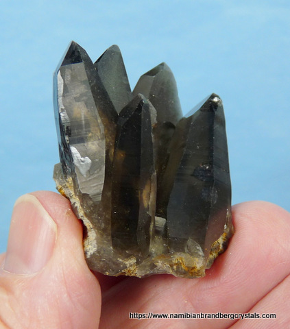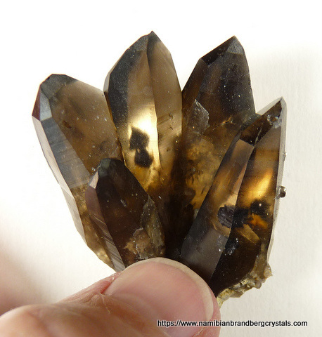 Description: A group of smoky quartz crystals with a piece of schorl embedded at the base. The crystals have a few beautiful inclusions of (what appears to be) schorl, which can clearly be seen when held against light (two upper right images). One of the terminations have a nick, while some of the other terminations have only minute nicks. The rest of the specimen has flaws and contact /pressure marks. Weight