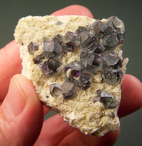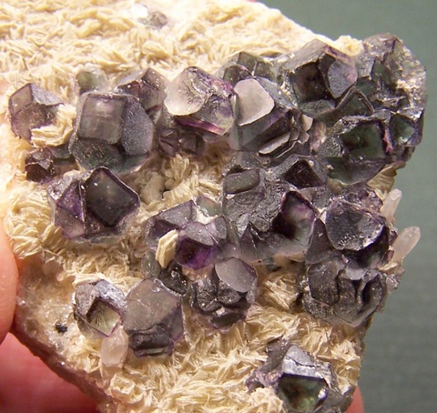 Measurements: 65 x 47 x 17 mm Description: Green and purple fluorite crystals (the largest, 8 mm) on muscovite. The muscovite crystals, in turn, sit on a matrix of clay and muscovite. There is very little damage to the fluorite crystals. Weight of Specimen: 56 g Chemical