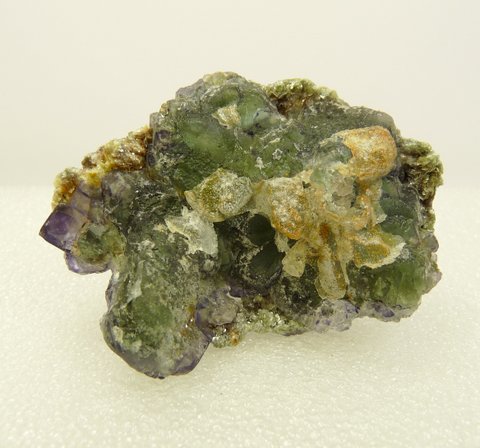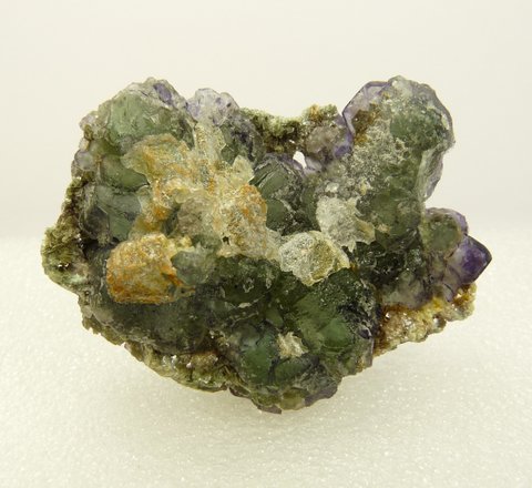 mm Description: A two-sided group of fluorite crystals, with colour ranging from green to purple. One of the sides has quite a bit of hyalite opal on surfaces, as well as bits of mica. Damage is