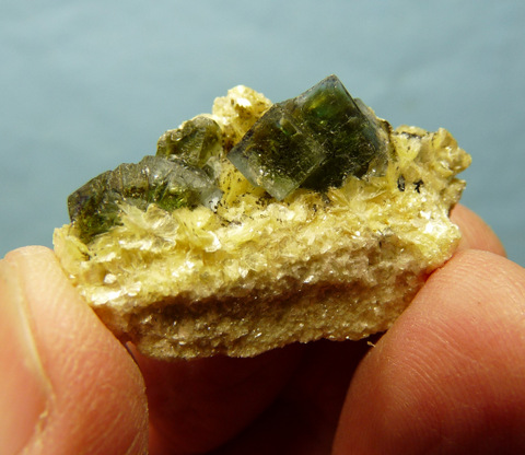 Description: A stunning, small specimen consisting of vivid, gemmy, green fluorite crystals and yellow mica crystals on a mica rich matrix. One of the fluorite crystals has a nick. Weight