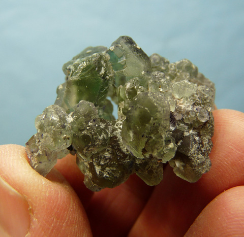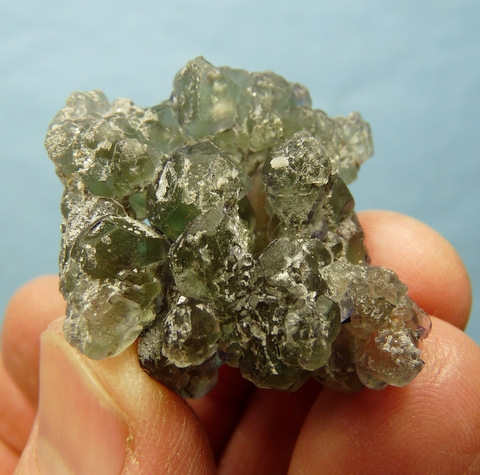 Measurements: 42 x 36 x 23 mm Description: A light greenish-grey, double sided cluster of fluorite crystals. It has a few tiny spots of hyalite opal on it. One side has no notable damage,