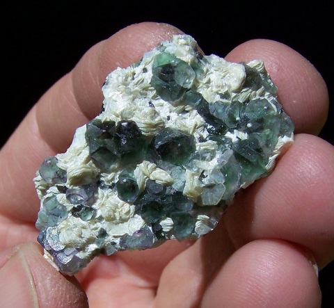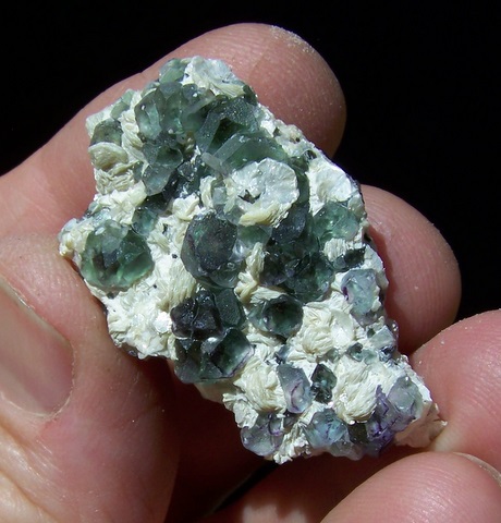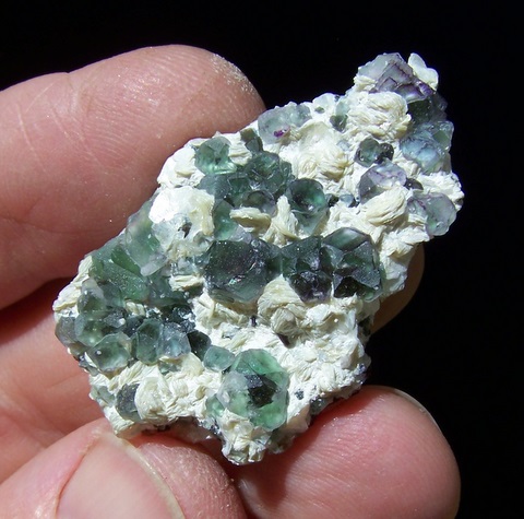Measurements: 42 x 25 x 13 mm Description: Green fluorite crystals (up to 5 mm on edge), a few with bits of purple colouring, rest on a conglomerate of feldspar, mica and schorl. There is only limited damage to the fluorite crystals at the edges of the specimen. Weight of Specimen: 16.2 g Chemical