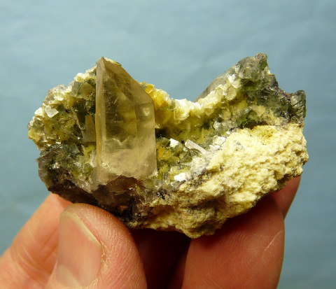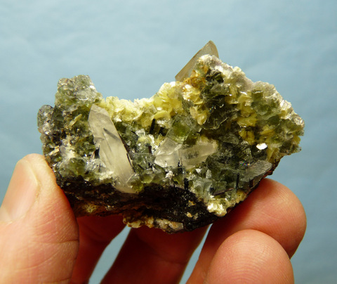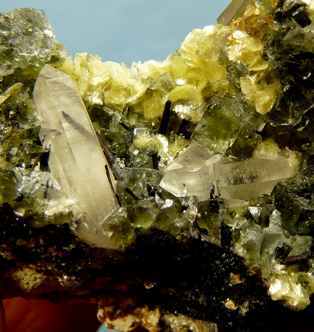 Description: Small, green fluorite crystals share a schorl and mica matrix with quartz, small schorl and muscovite crystals. Some of the quartz crystals have schorl crystal inclusions. The largest quartz crystal has a nick close to the termination point, along one of the termination ridges. Some of the fluorite crystals have damage to their edges. The
