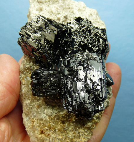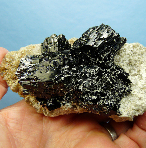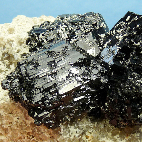 group of glossy, jet-black schorl crystals (variety foitite) on a