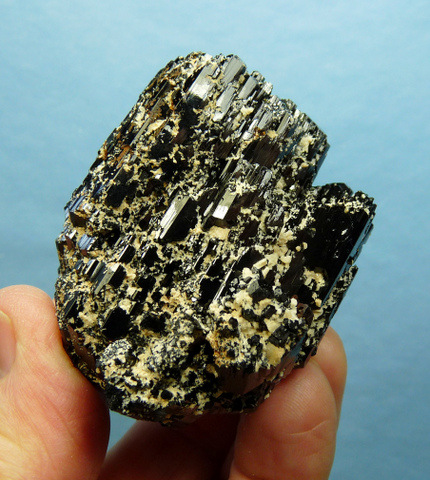 Measurements: 62 x 58 x 52 mm Description: A group of shiny, jet-black schorl (variety foitite) crystals with lovely facets and multiple terminations. The specimen is partly covered with light cream to rusty coloured feldspar. The only damage is to the bottom where it parted from its matrix. Weight of Specimen: 229.5 g Chemical