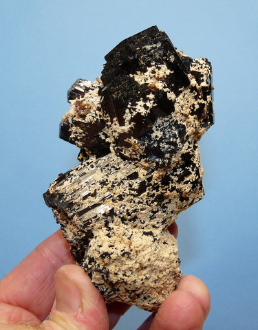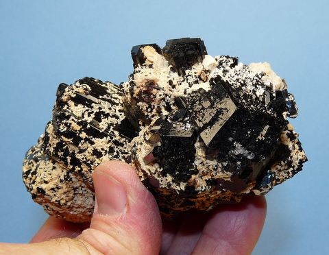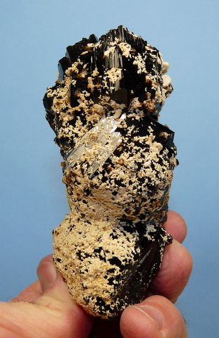 Measurements: 108 x 59 x 52 mm Description: A lovely group of schorl (variety foitite) crystals with multiple terminations and some with ‘mercedes’ signs. The crystals have a shiny, jet-black colour and are partially covered with feldspar. The