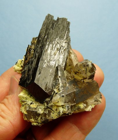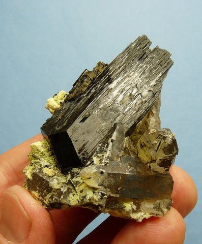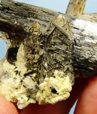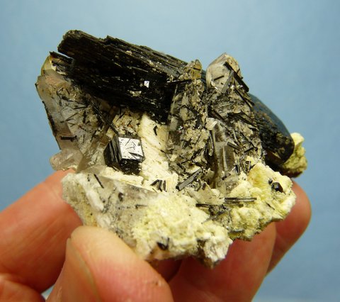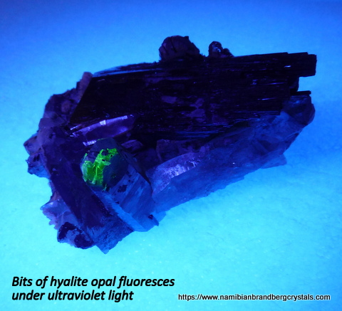 Measurements: 65 x 45 x 28 mm Description: A schorl crystal (variety foitite, 56 mm long) together with a small schorl crystal, sit on a quartz matrix with quartz crystals and thin schorl needles in and on the surfaces. There are a few very small, clear crystals (to us, unkown) on some surfaces, as well as bits of feldspar with a yellowish (to us, unknown) mineral, and bits of hyalite opal. The schorl crystal has bits of damage to the multiple (flake-like) terminations, while one quartz crystal has a small nick to its termination. This very interesting specimen with five different minerals, displays well on a flat surface. Weight of Specimen: 90.1 gChemical