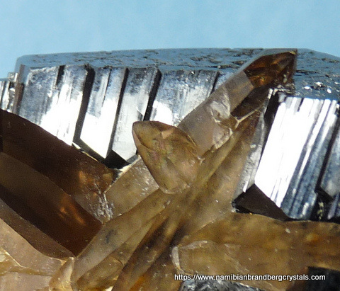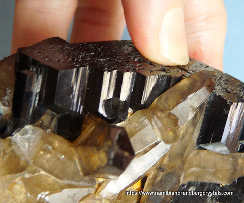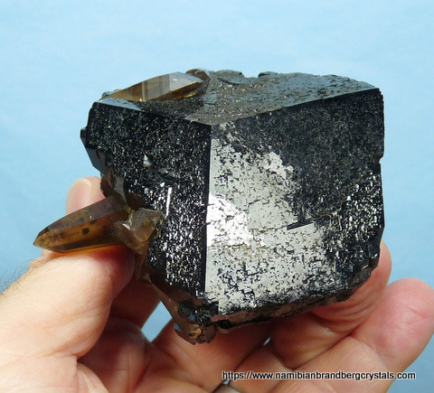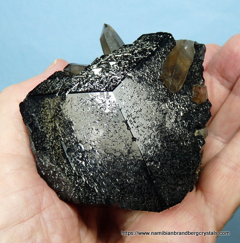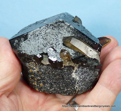 Measurements: 80 x 70 x 50 mm Description: A large schorl crystal with several smoky quartz crystals partly embedded in it. The top of the schorl crystal has relatively little damage, but some sides have large contact and pressure marks. The largest quartz crystal's termination has a long, thin nick, while the rest of the quartz has contact marks and nicks. The specimen displays well on a flat surface. Weight
