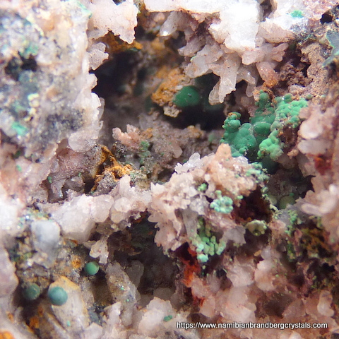 x 56 x 55 mm Towards the side of the specimen is another, lesser cavity with a few lovely, very small balls of malachite and some minute white.crystals. This is a specimen that can really be appreciated when viewed through a loupe! It displays well on a flat surface. Weight of