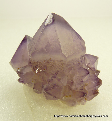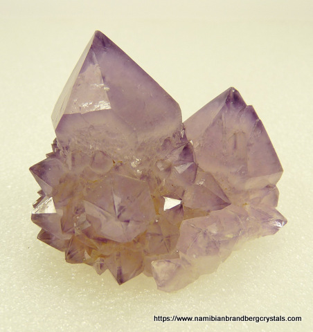 Description: A group of shiny cactus quartz crystals with light amethyst colouring. Some terminations have minute nicks, while the only other notable damage is to some of the specimen's edges. The specimen displays well on a flat surface, all-round. Weight