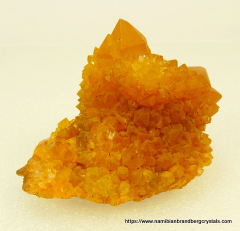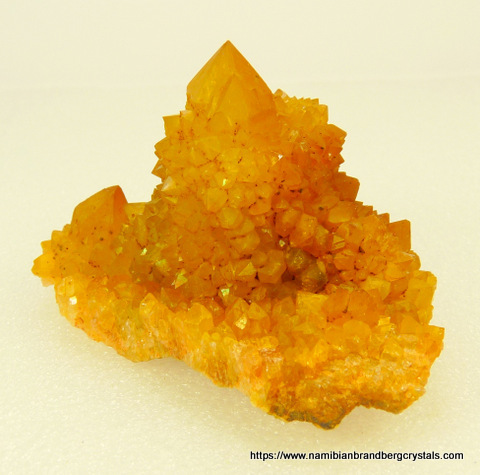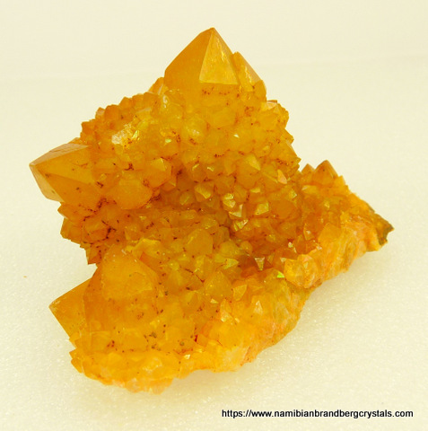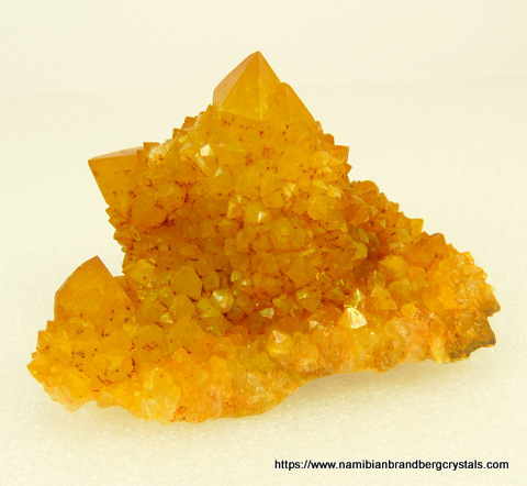 Description: Cactus quartz crystals with a coating of intense yellow iron oxide, commonly called "canary quartz". The main terminations have no damage, while the rest of the specimen has a few nicks. The specimen displays well on a flat surface, all-round. Weight