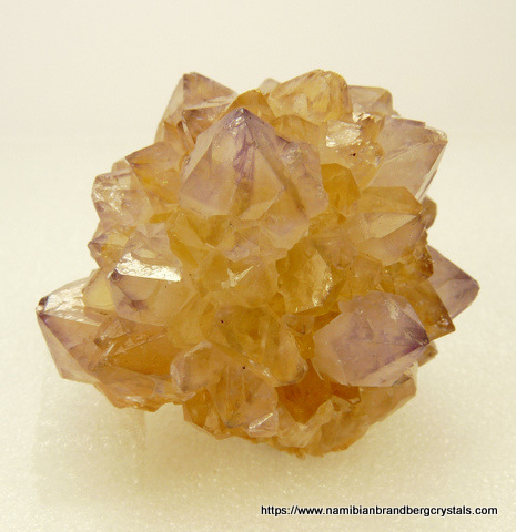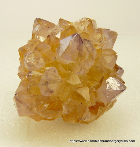 Description: A cluster of semi-clear quartz crystals with very light amethyst colouring. The yellowish colour in the specimen is due to iron oxide staining. The image bottom right shows the bottom of the specimen, where one can clearly see how a secondary quartz crystal growth was preceded by an initial quartz growth, now forming the 'core' of the specimen. This lovely specimen