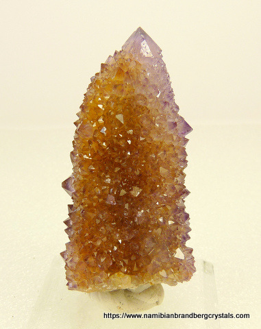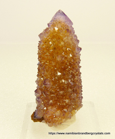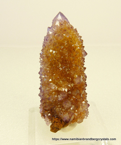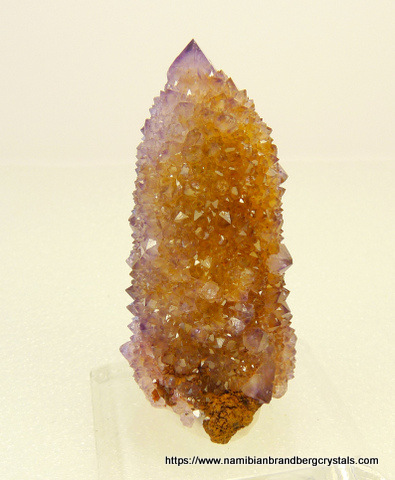mm Description: An amethyst quartz crystal with about half of its surface stained by iron oxide, giving it a yellow colour. The specimen has a lovely shimmer to it. The termination point has only a