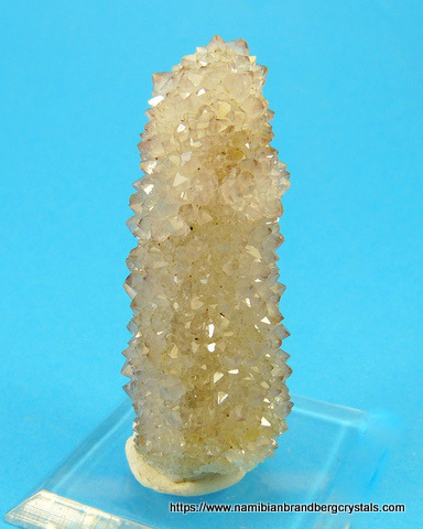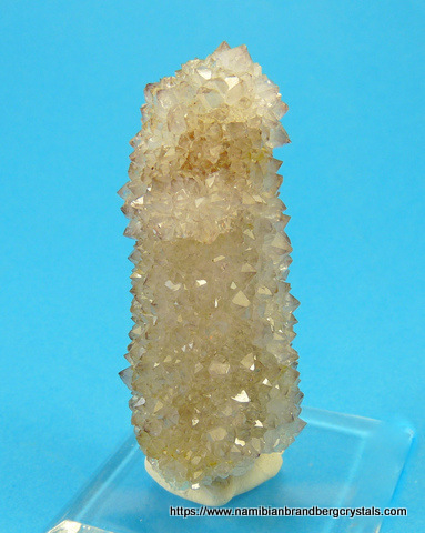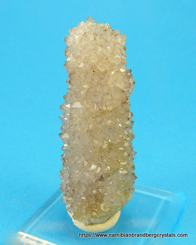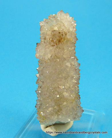 Measurements: 50 x 20 x 20 mm Description: A cactus quartz crystal with greyish colouring and nice, natural shimmer. The crystal is somewhat unusual, in the sense that it does not have a specific termination point / 'capping' like cactus quartz crystals usually have, but its termination is covered by very small crystals, like those that cover its sides. The specimen