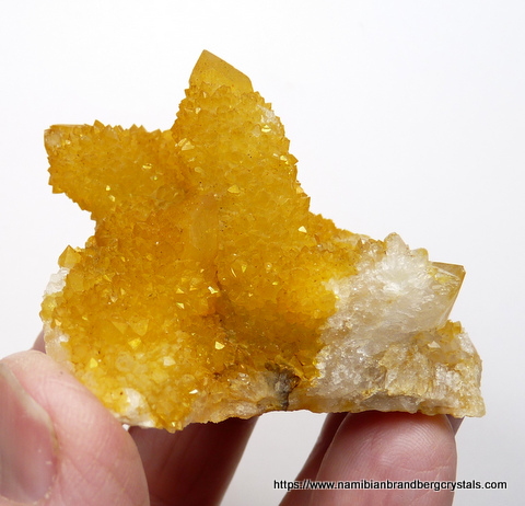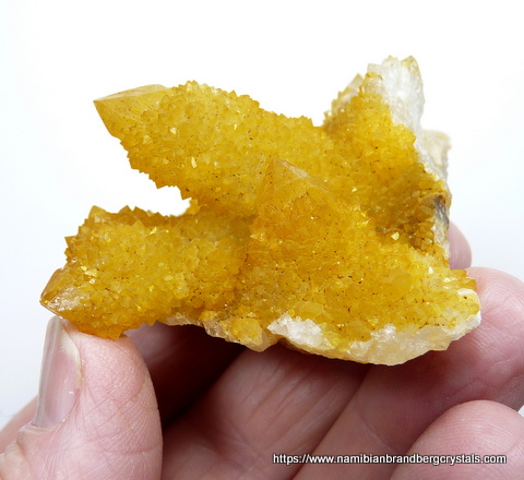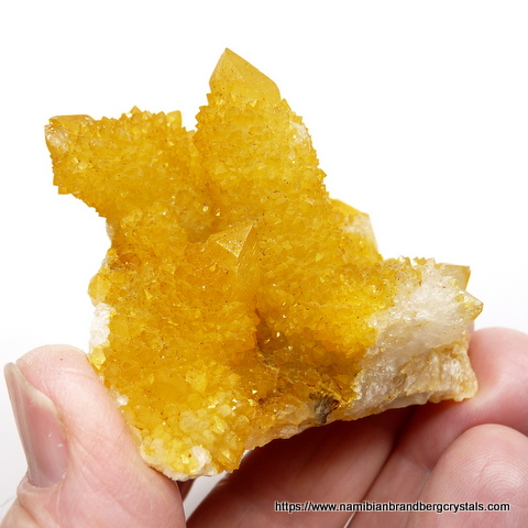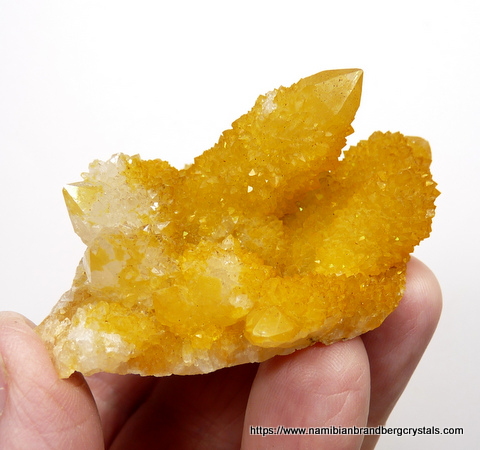 Description: A group of cactus quartz crystals with an intense yellow colour, caused by a coating of iron oxide. Quartz with such a deep yellow colouring, is rare from this area, and prized. Two